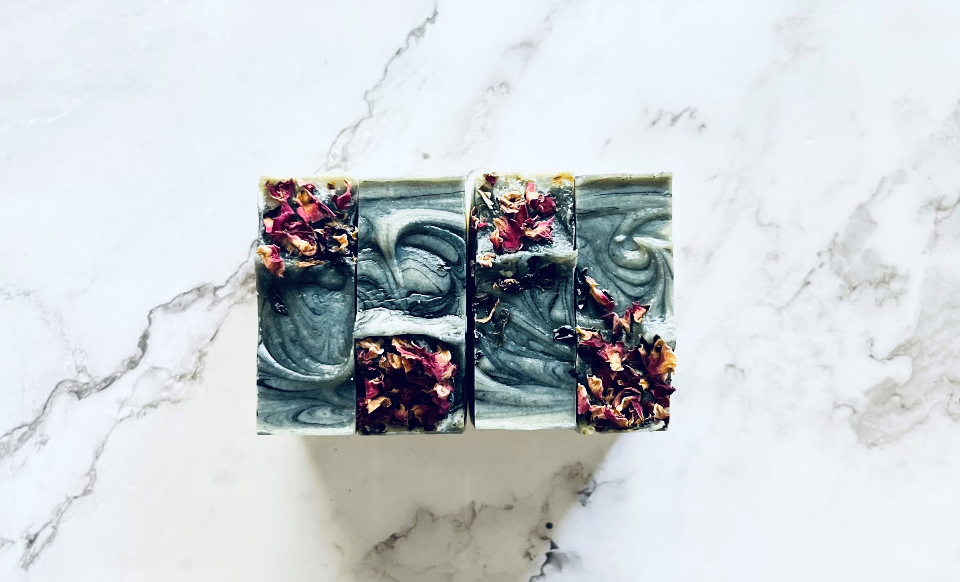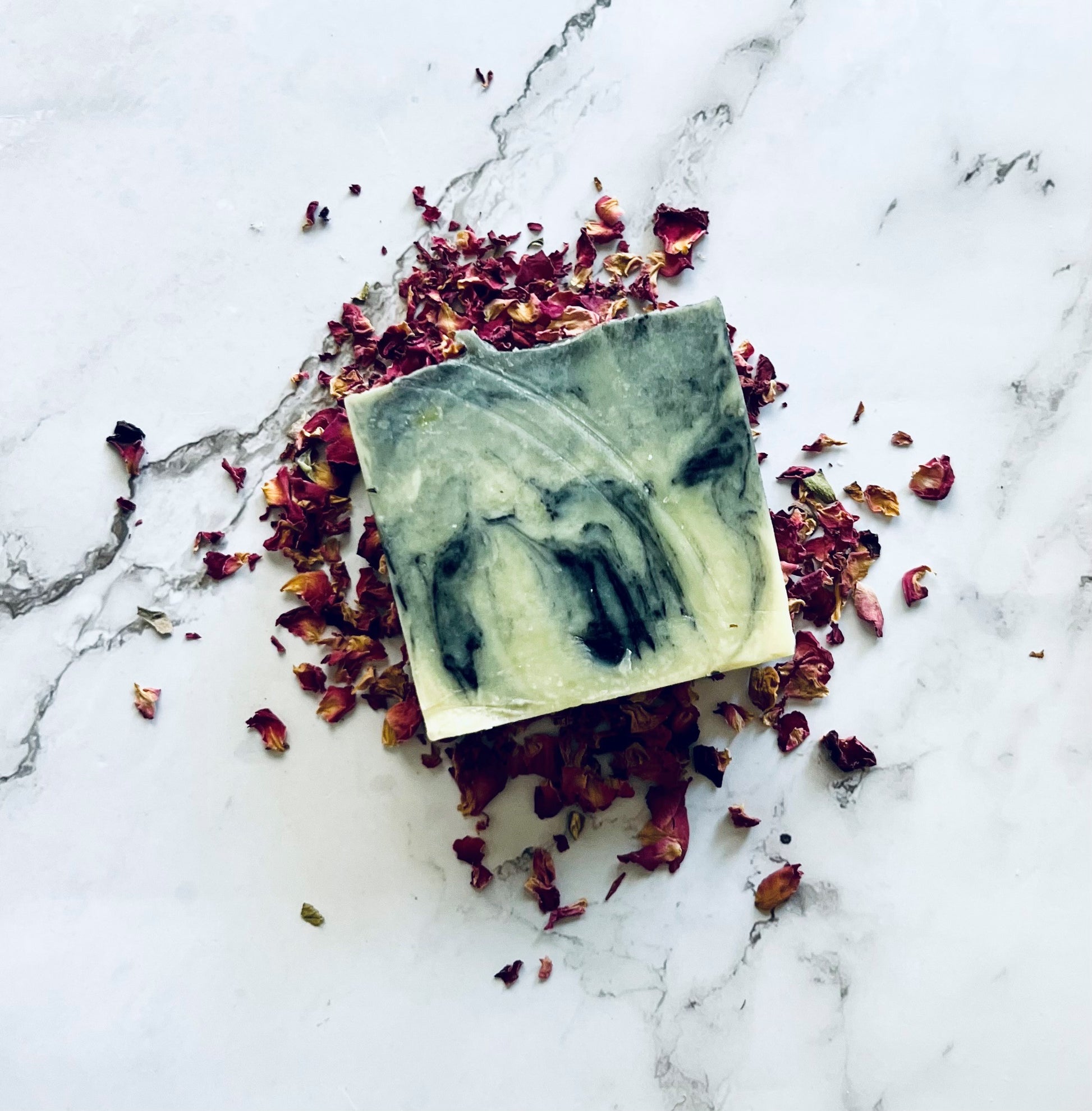 Ingredients: saponified coconut oil, olive oil, palm oil, hemp seed oil, shea butter, castor oil, activated charcoal, essential oils of vetiver, amyris, silver birch, cedarwood, balsam, thyme flower, fragrance, topped with red roses