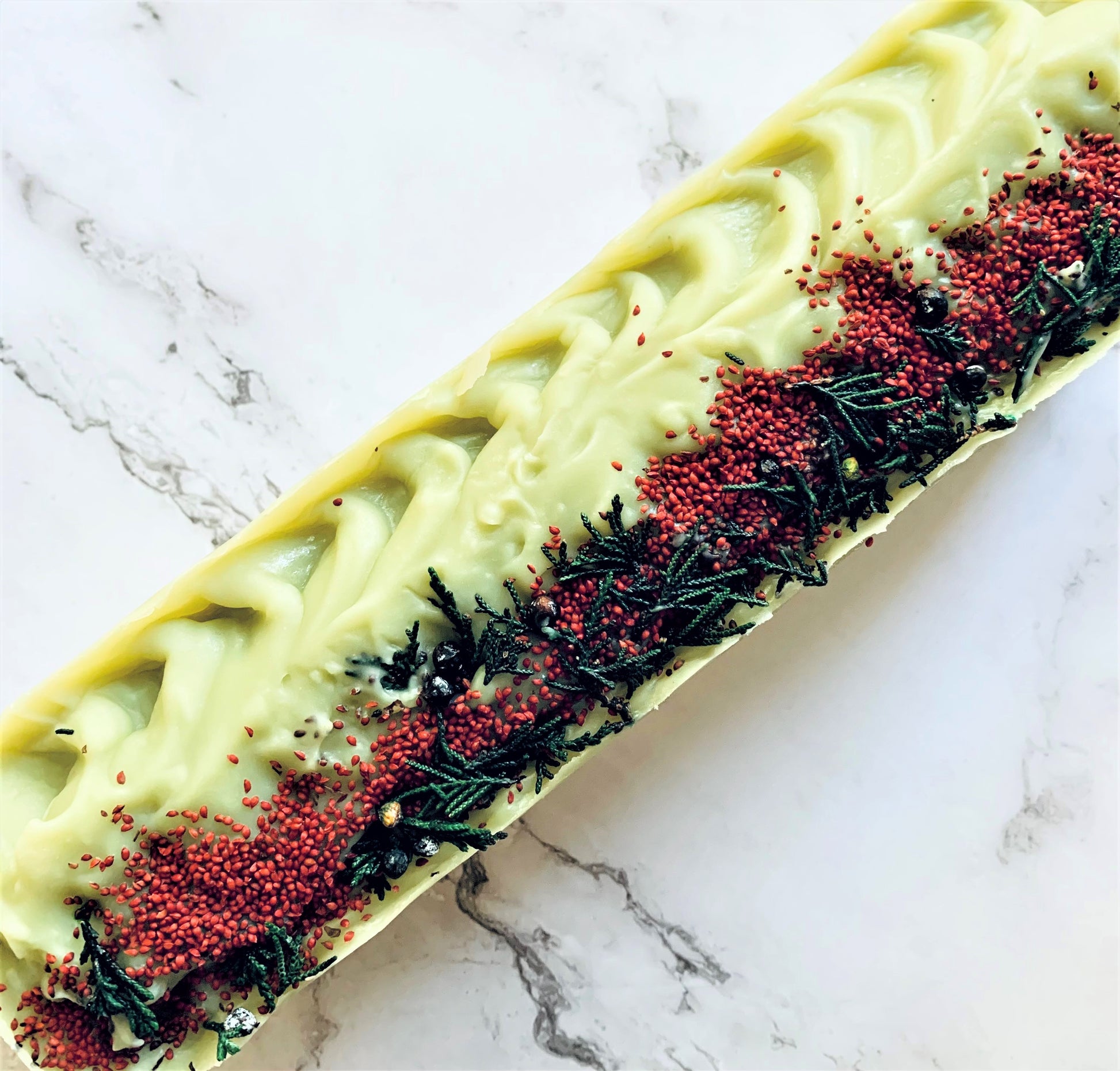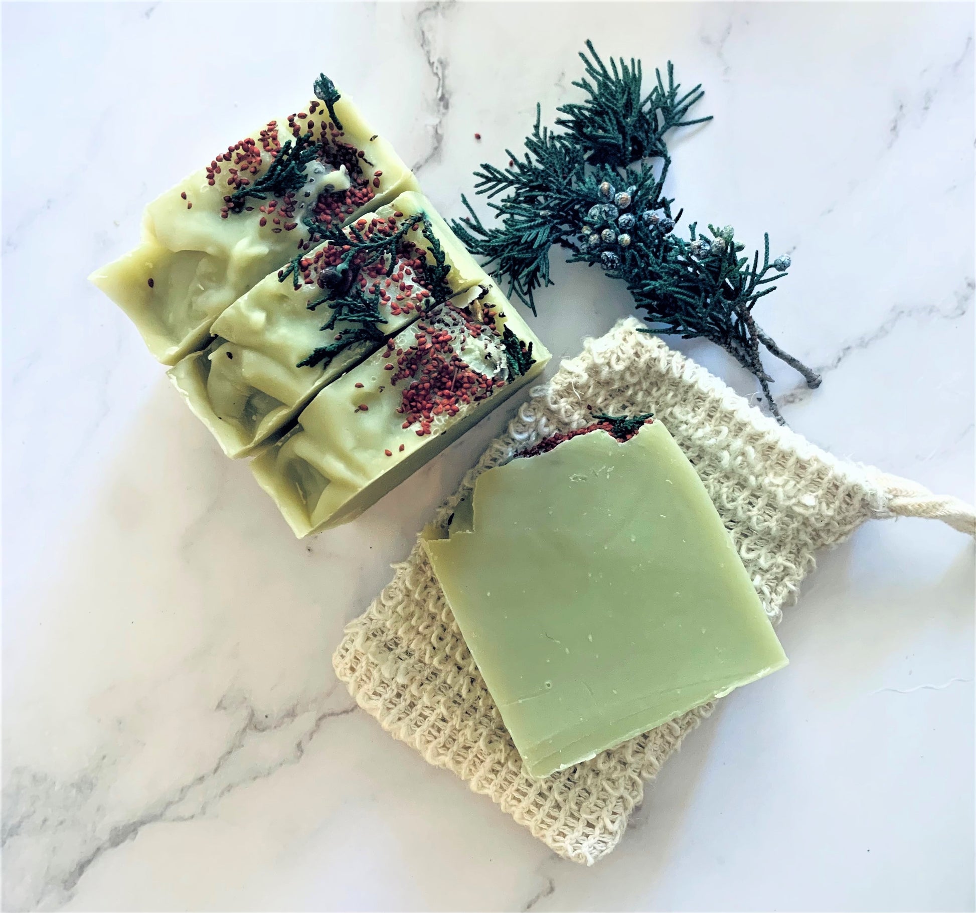 Ingredients: saponified coconut oil + olive oil + palm oil + hemp seed oil + shea butter + castor oil + french green clay + grapeseed oil + fragrance + topped with cranberry seeds + juniper sprigs